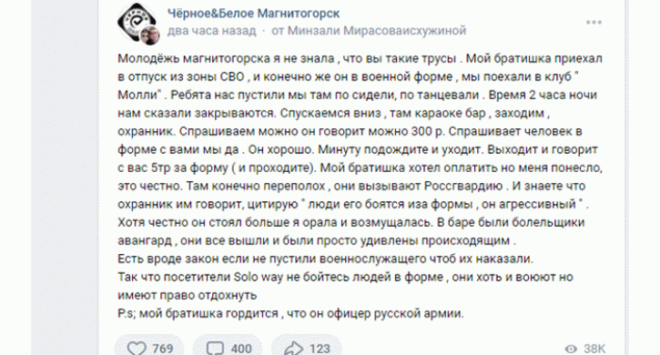 Женщина утверждает, что ее брат приехал в отпуск из зоны проведения СВО. «Мы поехали в клуб Molly. Ребята нас пустили, посидели, потанцевали. (...) Спускаемся в караоке-бар (...) Охранник выходит и говорит – с вас 5 тр за форму (и проходите). Мой братишка хотел оплатить, но меня понесло. Там, конечно, переполох, они вызвали Росгвардию», – описала события жительница города.