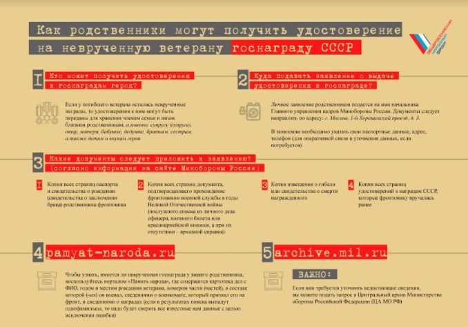 Если у погибшего ветерана остались не врученные награды, то удостоверения к ним могут быть переданы для хранения членам семьи и иным близким родственникам, к которым относятся супруг (супруга), отец, мать, дети, а также братья и сестры, бабушка, дедушка и внуки героя. Пошаговая инструкция о том, как получить документ о не врученной награде, – в рубрике ЧТО ДЕЛАТЬ Агентства новостей «Доступ».
