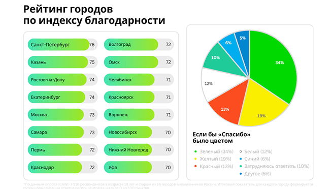 «На основе полученных данных был рассчитан индекс, оценивающий готовность жителей выражать благодарность и распространенность этой практики в повседневном общении. Лидерами рейтинга городов стали Санкт-Петербург, Казань, Ростов-на-Дону, Екатеринбург и Москва», – говорится в комментарии.