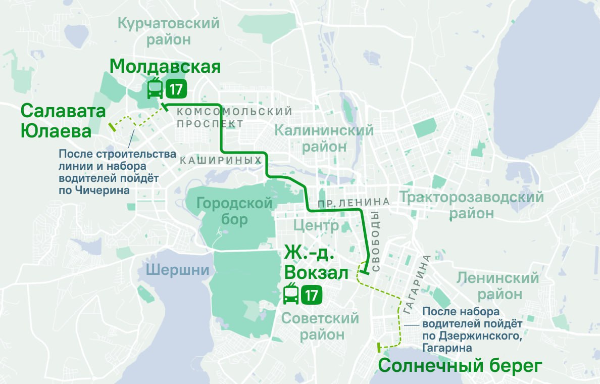 Планируется продление трассы движения троллейбуса от улицы Молдавская до улицы Салавата Юлаева с одной стороны и от железнодорожного вокзала по путепроводу Челябинск-Главный и улице Гагарина до поселка «Солнечный берег» – с другой.
