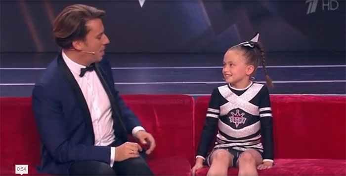 Девочка рассказала о том, что такое чир-спорт и поделилась своими успехами. По ее словам, этот вид спорта не такой простой, каким кажется на первый взгляд. На передаче копейчанка встретилась с актрисой Чулпан Хаматовой, с которой она познакомилась на Всемирных играх победителей, которые проводятся для победивших рак детей.