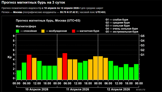 Модели показывают высокие – на уровне 90% – вероятности слабых магнитных бурь и возмущений в предстоящие трое суток, с пятницы по воскресенье, с 10 по 12 апреля.
