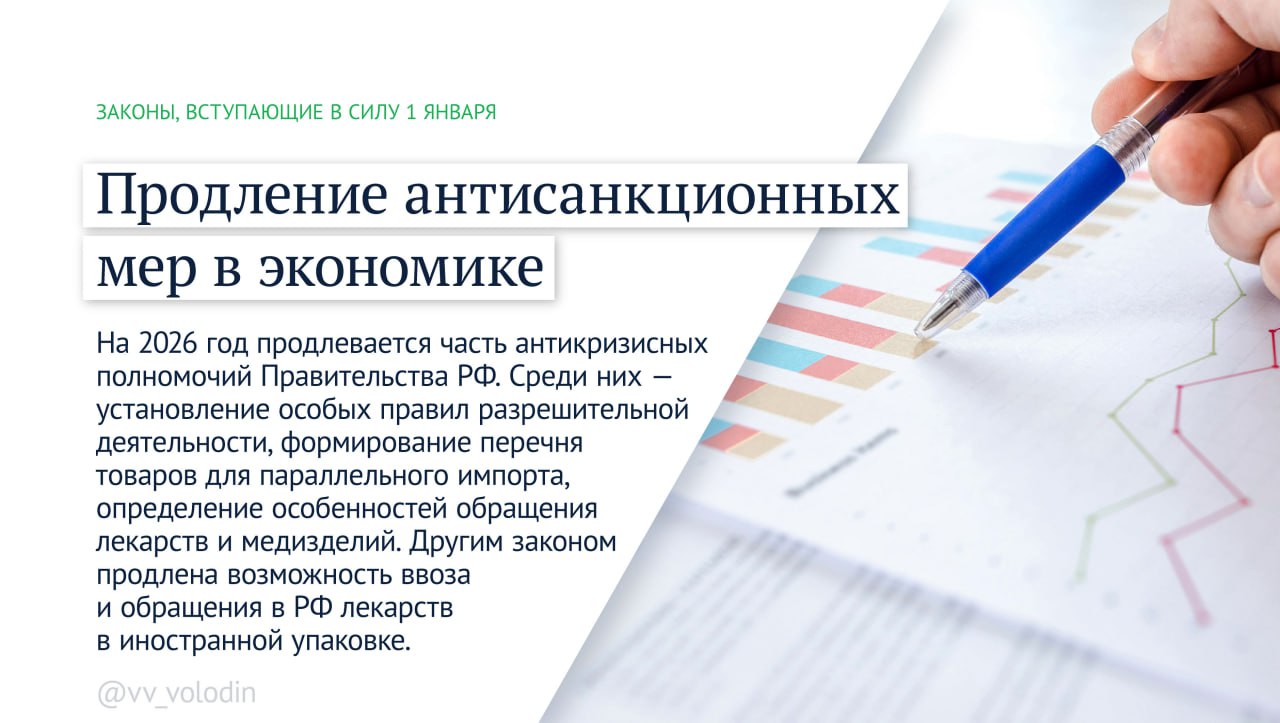Продление антисанкционных мер в экономике. На 2026 год продлевается часть антикризисных полномочий правительства РФ. Среди них – установление особых правил разрешительной деятельности, формирование перечня товаров для параллельного импорта, определение особенностей обращения лекарств и медизделий. Другим законом продлена возможность ввоза и обращения в РФ лекарств в иностранной упаковке.