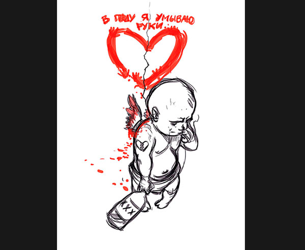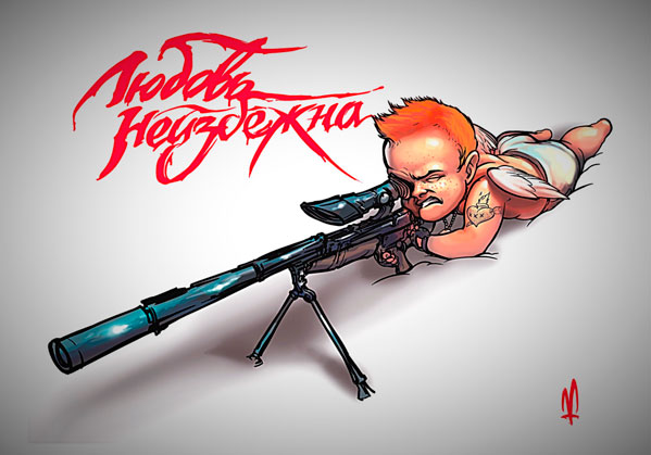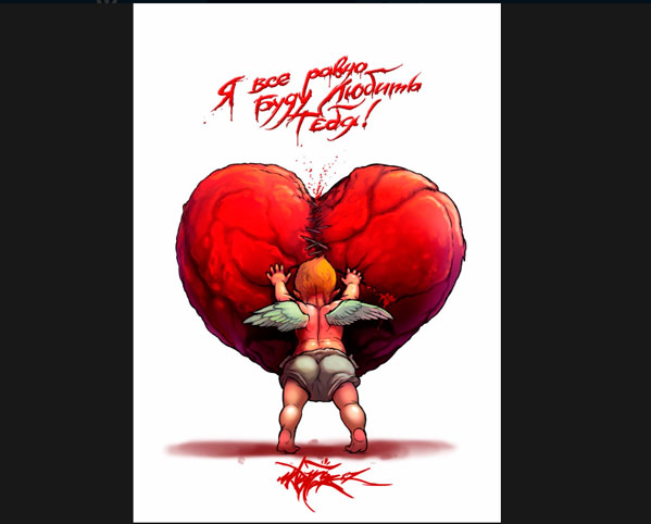 «Решайся! Очередь или контрольный – каждый выбирает для себя сам», – с таким посылом челябинский художник Маркер обнародовал свои открытки, главным героем которых является вооруженный Купидон. Дерзкий ангелок «косит» людей наповал.