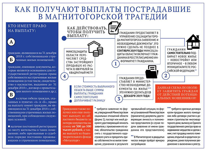 Общий объем выплат пострадавшим в магнитогорской трагедии и членам их семей из федерального и областного бюджетов по данным на 17 января превысил 108 млн рублей. Выплаты продолжаются.