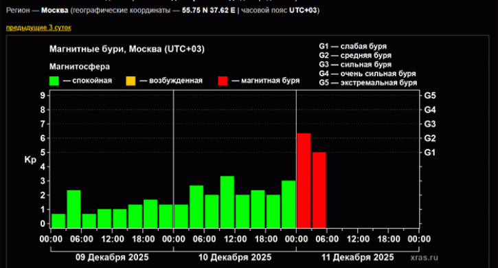 Магнитная буря произошло ночью 11 декабря, в моменте она превысила уровень G2 (граница между средней и сильной).