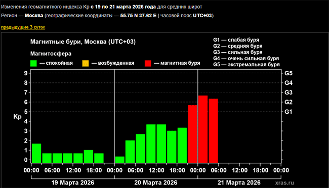 Пик космического шторма придется на первую половину субботы, 21 марта, после чего, как прогнозируется, буря будет ослабевать и ближе к вечеру-ночи прекратится. В последующие два дня возмущения геомагнитного поля продолжатся, но уже меньшей интенсивности, в понедельник, 23-го, уже обойдется без них. Это предварительные расчеты.