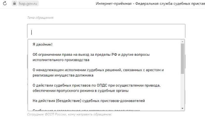 «Чтобы сообщить об ошибке, физическим лицам необходимо заполнить форму электронного обращения в сервисе "Интернет-приемная", выбрав тему "Я – двойник". На рассмотрение обращения, идентификацию гражданина, устранение нарушений и ответ заявителю отводится два дня. Обращение в день его поступления передается руководителю территориального органа Федеральной службы судебных приставов для организации рассмотрения», – пояснили в ведомстве.