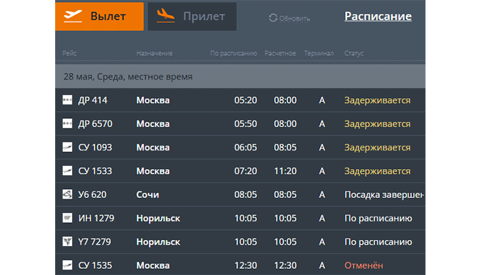 На вылет опоздали рейсы ДР 414, СУ 1093 и СУ 1533 авиакомпаний «Победа» и Аэрофлот. На прилет отменен дневной рейс СУ 1534 из российской столицы, на вылет – СУ 1535.