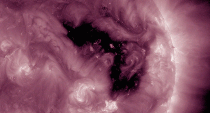 «Дыра хорошо различима на поступающих изображениях Солнца, на которых наблюдается как темная структура размером около полумиллиона километров, занимающая значительную часть видимого солнечного диска», – говорится в комментарии Лаборатории солнечной астрономии (ИКИ РАН и ИСЗФ СО РАН).