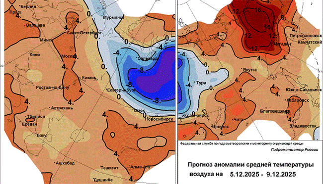 «В субботу и в воскресенье с западным ветром температурный фон еще будет выше нормы на 7-10 градусов, снег ожидается лишь местами. В ночь на понедельник со сменой ветра (подует северный) начнет распространяться холодная арктическая воздушная масса, что приведет к понижению температуры до климатической нормы. При этом ожидаются снегопады, в северных районах – сильные, высота снежного покрова там может повыситься на 4-8 см. В последующие дни с северо-запада опустится холодный антициклон, осадки прекратятся, а морозы будут усиливаться и распространяться дальше – на юг. Температурный фон уже станет ниже климатической нормы на 4-8 градусов. По предварительным данным, 9-10 декабря в ночные часы столбики термометров будут опускаться до минус 21-26. В последующие дни морозы начнут ослабевать», – прокомментировали в Челябинском ЦГМС.