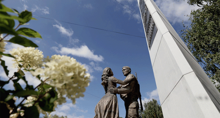 Этот памятник расположен на невысоком постаменте в окружении деревьев и цветов. Композиция из двух фигур, воина и девушки в моменте прощания, символизирует верность и ответственность, отвагу и силу духа русского народа. На фоне бронзовых скульптур возвышается гранитная стела с тематическими рельефными изображениями.