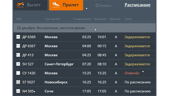 На вылет задерживаются рейсы ДР 6570, ДР 6568 и ДР 414 – все в российскую столицу, ДР 550 и 5Н 528 – в Санкт-Петербург, отменен рейс СУ 1421 в Москву.