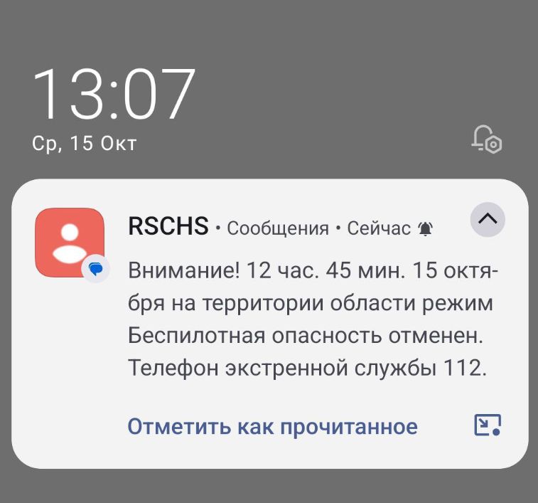«Внимание! В 12:45 на территории региона отменен режим "Беспилотная опасность". Телефон экстренной службы – 112», – говорят в оперштабе.