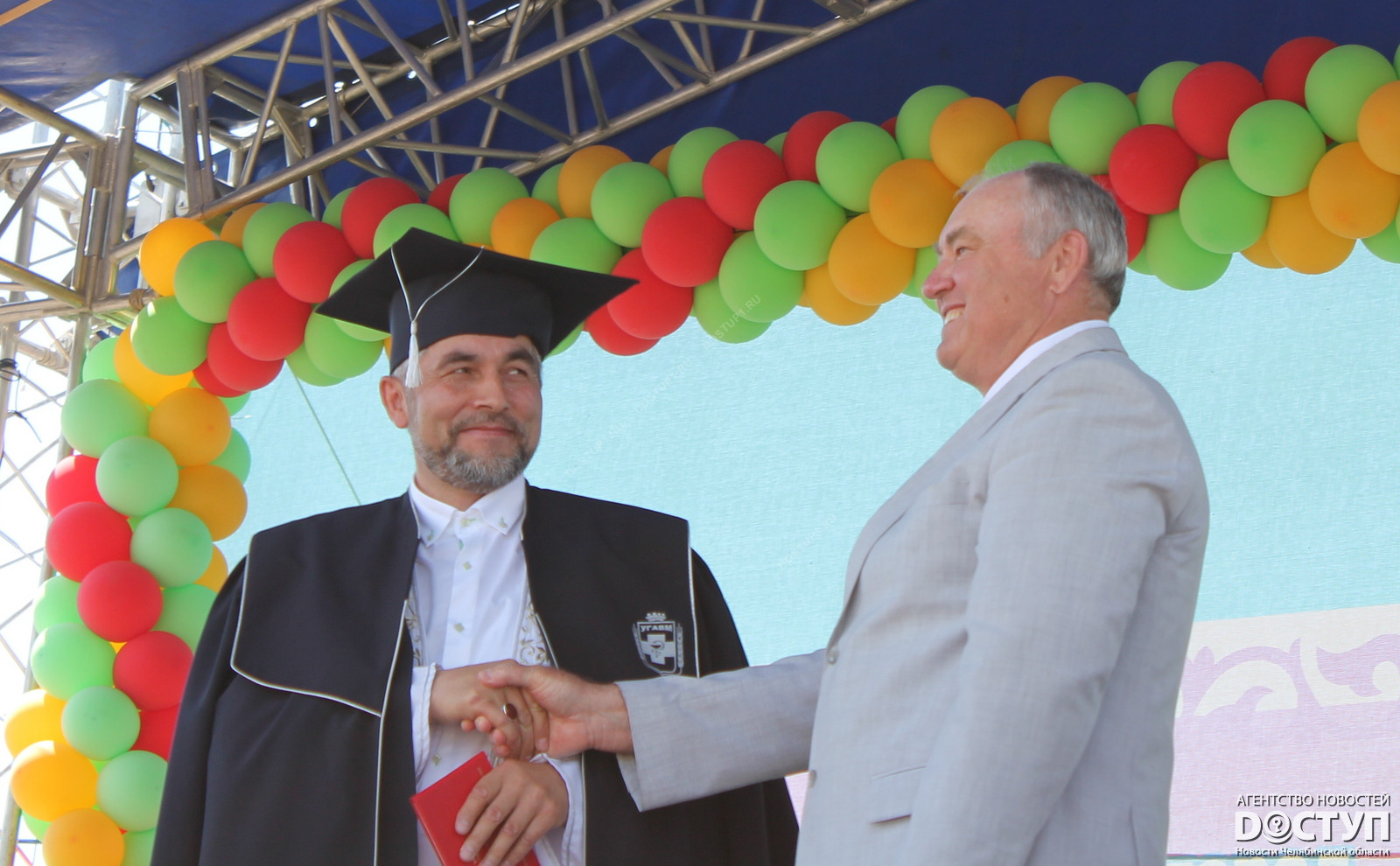 «Поздравляю всех с сегодняшним замечательным праздником. Всем вам желаю солнечного настроения, такого же, как сегодняшний день. Желаю вашим родным и близким крепкого здоровья, и чтобы у нас всегда было мирное небо, и мы могли работать на благо нашей любимой Челябинской области и всей России. Пользуясь случаем, позвольте мне выполнить поручение Ученого совета университета и вручить диплом почетного профессора университета нашему замечательному выпускнику, сегодняшнему муфтию Челябинской и Курганской областей, члену Попечительского совета вуза Ринату Раеву», – выступил ректор.