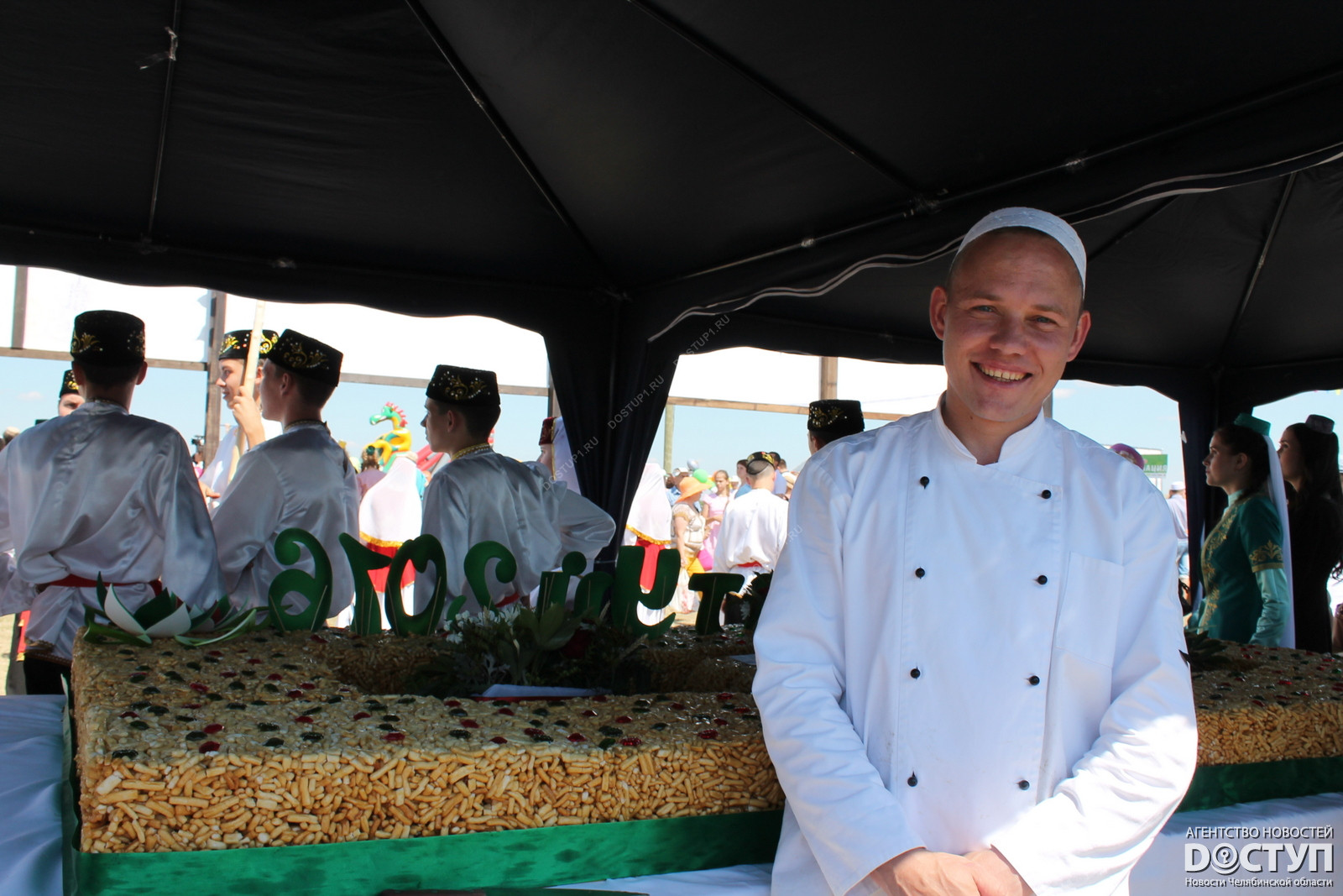 Несмотря на то, что размеры восточной сладости (2,5 на 1,5 метра) анонсировались еще за неделю до Сабантуя, размах кулинаров удивил всех – первый на Южном Урале рекордный чак-чак весил 220 килограммов! Композицию, представляющую собой золотисто-медовый прямоугольник на зеленом фоне, поставили в самом центре подворья.