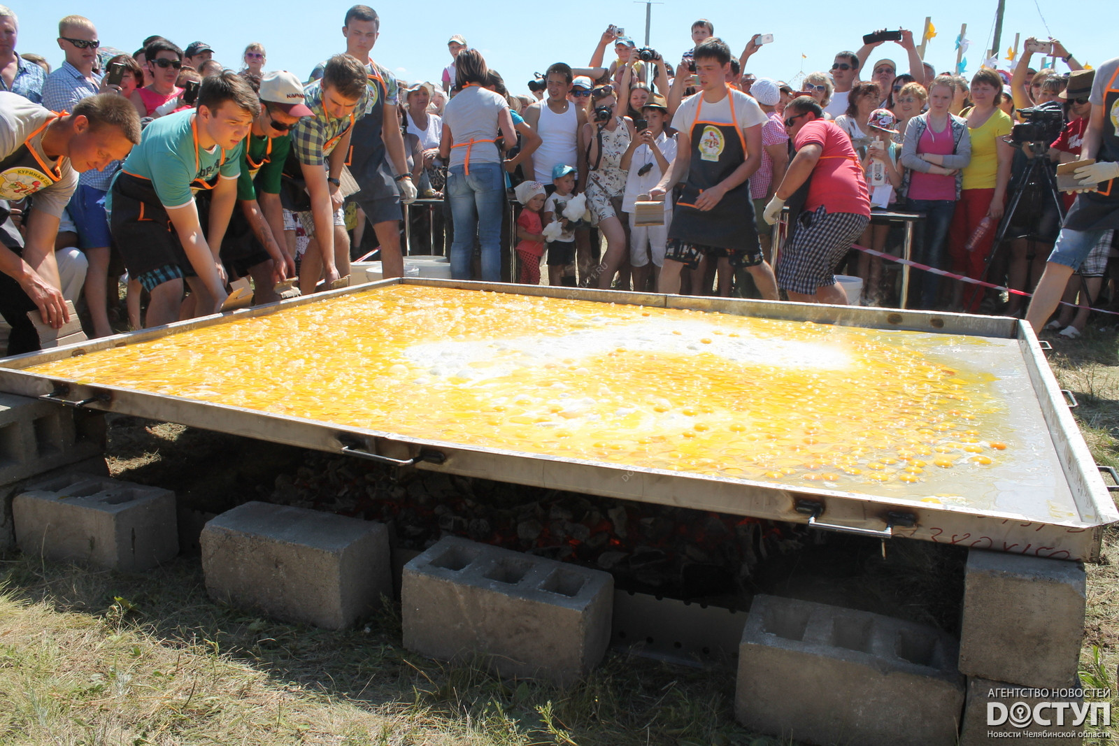 На одной из полян Сабантуя шесть поваров за короткое время разбили 3 тыс. куриных яиц. После того как яичница испеклась, всем желающим предложили попробовать эксклюзивное блюдо.