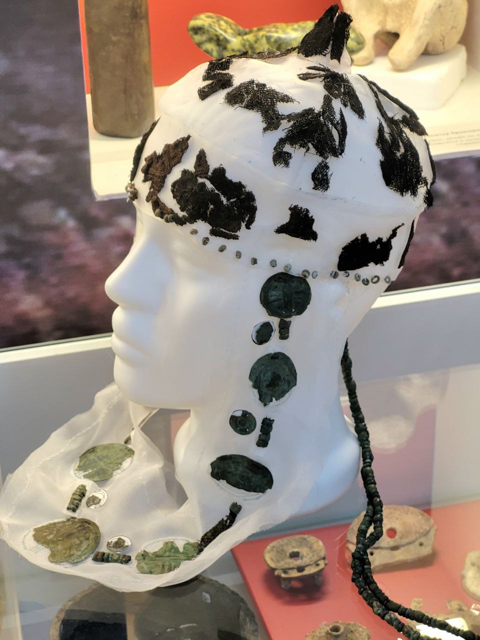 Реконструкция показала, что это была не просто шапка, а сложный головной убор, изготовленный в технике гобеленового плетения с использованием разноцветного бисера и отделкой из меха. И тогда, как пазл, собралась вся картина. Вместе с тканью в захоронении были найдены бронзовые украшения, которые ранее не могли точно атрибутировать. После реконструкции шапки стало ясно, что это – накосное украшение (или накосник) и лицевая подвеска, являвшиеся частью единого церемониального головного убора. Шапка, накосник, лицевая подвеска и другие украшения сложились воедино, восстановив полный облик ритуального облачения девушки высочайшего статуса.