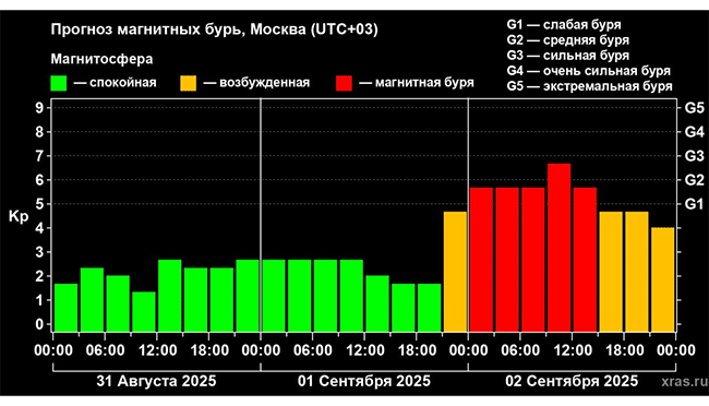 «Геомагнитные возмущения, согласно расчету, начнутся 1 сентября около 23 часов по московскому времени, продлятся от 30 до 45 часов, то есть весь вторник, 2 сентября, и как минимум часть среды. Пик геомагнитных возмущений должен быть пройден около полудня во вторник, когда геомагнитные индексы выйдут на уровень около Kp=7, что соответствует магнитным бурям уровня G3», – говорится в комментарии Лаборатории солнечной астрономии (ИКИ РАН и ИСЗФ СО РАН).