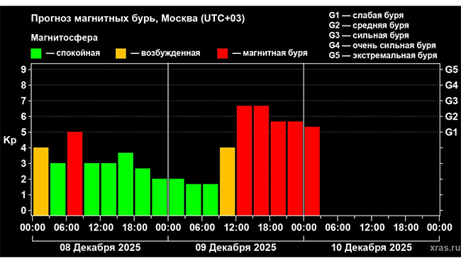 «Магнитные бури уровня G2-G3 (от средних до сильных) ожидаются во вторник и среду, 9 и 10 декабря, в результате прихода к Земле выброса плазмы после вспышки класса M8.1, произошедшей ночью 7 декабря, – говорится в сообщении Лаборатории солнечной астрономии ИКИ РАН.