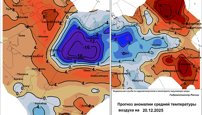 Непосредственно в Челябинске в субботу ночью облачная погода, снег; днем переменная облачность, небольшой снег. На дорогах гололедица в виде снежного наката. Ветер северной четверти 4-9 м/с, порывы до 12 м/с. Температура воздуха 20 декабря ночью минус 20-22, днем – 19-21, понижение в течение дня до 26. В воскресенье ночью переменная облачность, днем облачно с прояснением, без осадков. Ветер северный с переходом на южный: ночью 3-8 м/с, днем 5-10 м/с. Температура воздуха 21 декабря ночью минус 30-32, днем минус 10-12. В понедельник облачно с прояснением, небольшой снег. Ветер южной четверти 4-9 м/с. Температура воздуха 22 декабря ночью минус 10-12, днем минус 4-6.