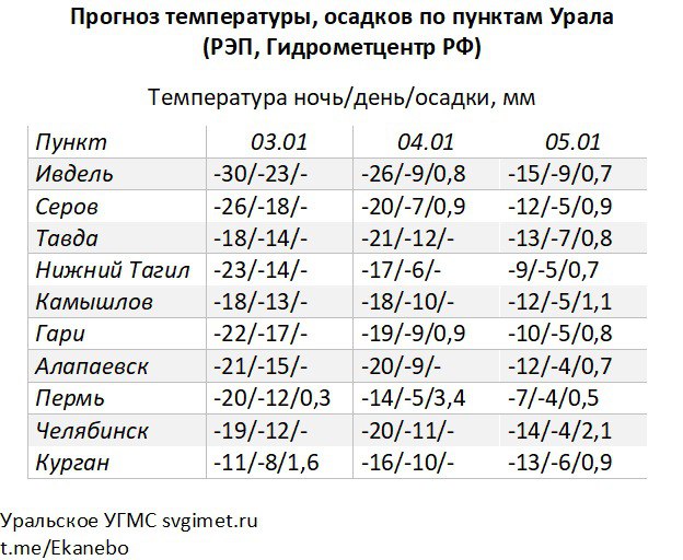 Ранее сообщалось, что 2 и 3 января над Уралом умеренно холодный воздух, оформленный в барический гребень: существенных осадков не ожидается, ветер слабый, в горах – умеренный. Температура днем 2 января минус 10-15, 3 января – на 4-6 градусов ниже. «Погодой значительной территории Европы и ЕТР управляет обширный циклон, несущий почти повсеместные снегопады, 4-5 января на его восточной периферии сформируются частные фронтальные циклоны, которые достигнут Предуралья и вызовут снегопады», – комментировали в Уральском УГМС.