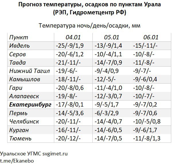По словам специалистов Уральского УГМС, 4-6 января центр циклона от западных границ страны переместится на северо-восток (на Коми и север УрФО), приподнимая на север фронтальную зону, отделяющую холодный воздух от более теплой массы Поволжья. Температура повысится повсеместно, даже на крайнем севере Свердловской области, где сегодня минус 30, на несколько дней она войдет в норму.