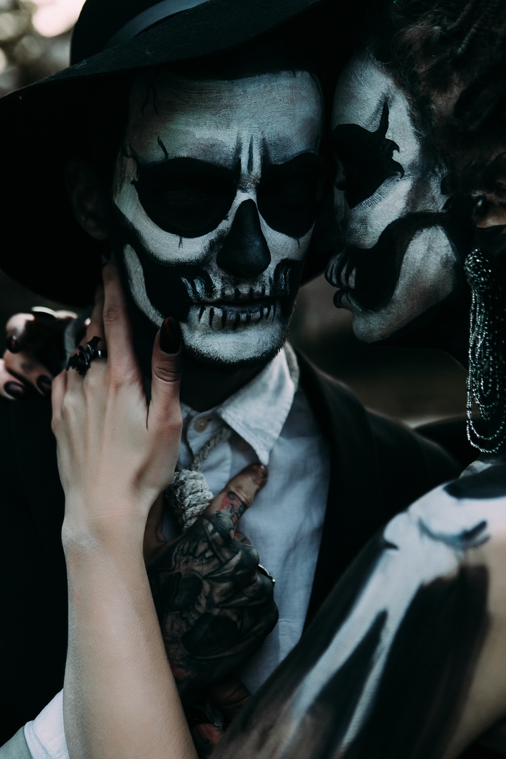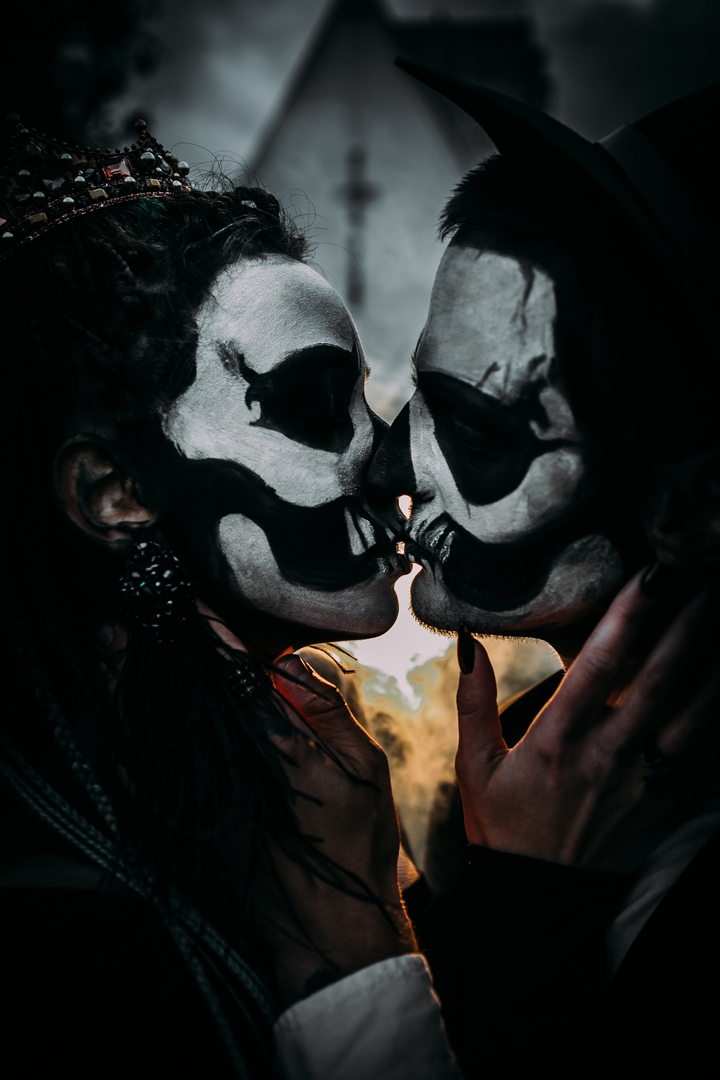 Супруги продумали все до мелочей: тыквы с вырезанными сердечками, обручальные кольца в виде летучих мышей, огромные готические украшения, устрашающий макияж «под черепа» и даже петля на шее жениха в качестве альтернативы галстуку.