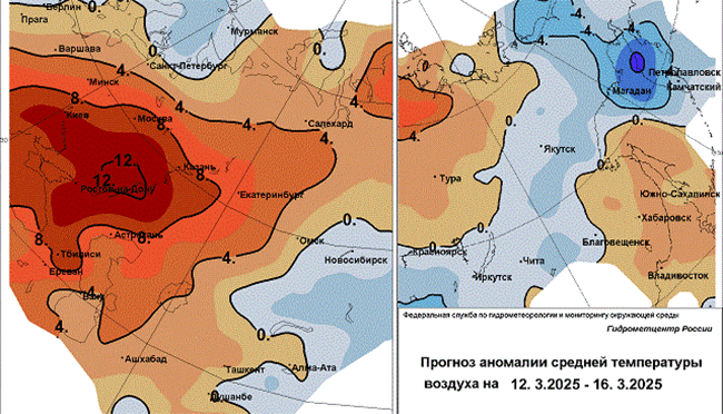 Почти повсеместно наступит оттепель, которая достигнет максимума в субботу, 15 марта, когда днем, согласно расчетам, вероятна температура плюс 5-9, ночью до плюс 3. Осадки могут в выпадать в виде мокрого снега и дождя, более интенсивными они предполагаются в воскресенье, 16-го.