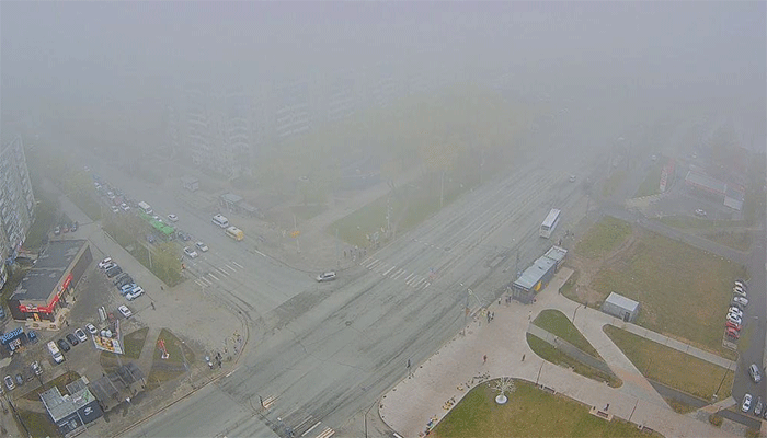 Центральную часть Челябинска утром 28 апреля окутал густой туман, передает корреспондент Агентства новостей «Доступ».
