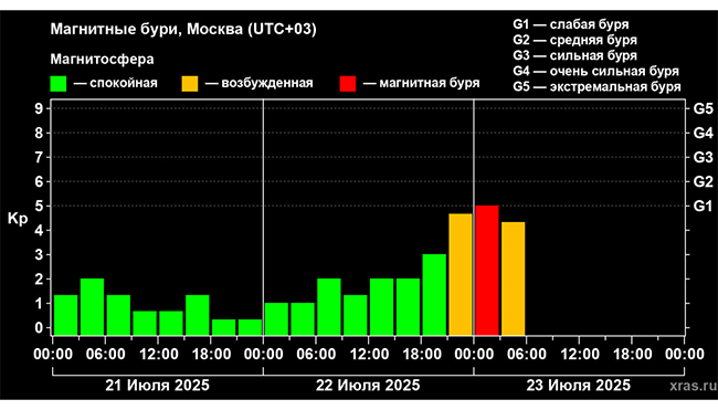 «Регистрируются геомагнитные возмущения планетарного масштаба, связанные с воздействием на планету потоков быстрого солнечного ветра. Геомагнитная обстановка начала осложняться вечером 22 июля, около 22 часов по московскому времени. Около двух часов ночи произошла первая короткая магнитная буря, уровень которой составил G1 – это минимальный балл по принятой 5-балльной шкале», – говорится в комментарии Лаборатории солнечной астрономии (ИКИ РАН и ИСЗФ СО РАН).