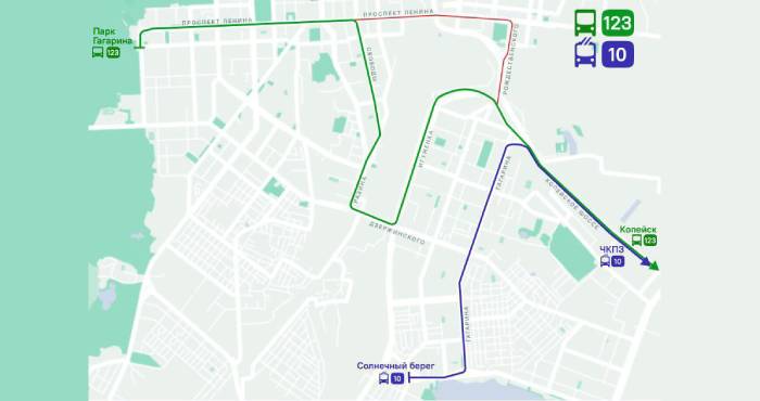 Автобус № 123 направят по маршруту от автовокзала Копейска, по Копейскому шоссе, Игуменке, Дзержинского, Степана Разина, Свободы, проспекту Ленина до парка Гагарина.
