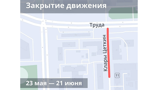 «В связи со строительством сетей водоснабжения с 23 мая по 21 июня будет закрыто движение транспорта по улице Клары Цеткин – от дома 11 до пересечения с улицей Труда», – сообщили в городской администрации.