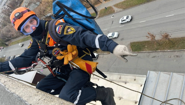 Специалист Челябинской городской спасательной службы спустился на козырек с помощью альпинистского снаряжения и вытащил животное. Кошка не пострадала.