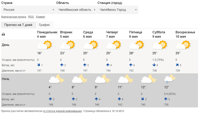 По информации Гидрометцентра России, 4 мая днем в городе будет плюс 16, 5-го – плюс 23, 6-7 и 9-10 мая – плюс 25. Самым теплым днем на текущей неделе будет пятница, 8 мая – по предварительным данным, воздух прогреется до 28 градусов.