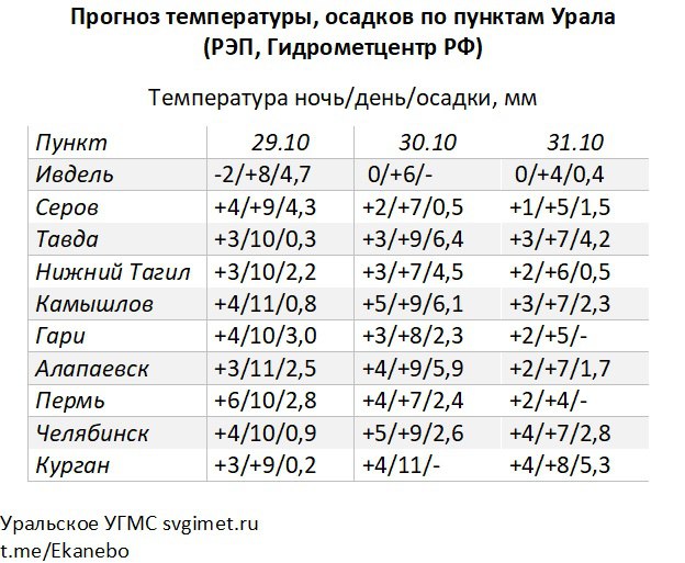 «Скорости движения в средней тропосфере сейчас большие, небольшой циклон с Центрально-Черноземного района быстро поднимется в район Вологды, вынося тепло с Европейского юга России на Урал. Дождь в зоне атмосферного фронта предстоящей ночью пройдет в большинстве районов, днем 29 октября осадков немного. Температура превысит норму на 3-6 градусов. Далее, 30 октября Каспийский циклон, пройдя через Челябинскую и Свердловскую области, добавит дождя, в горах севера он будет переходить в снег. С 31 октября при затоке холодного воздуха в тыл циклону температура начнет понижаться», – говорят в Уральском УГМС.