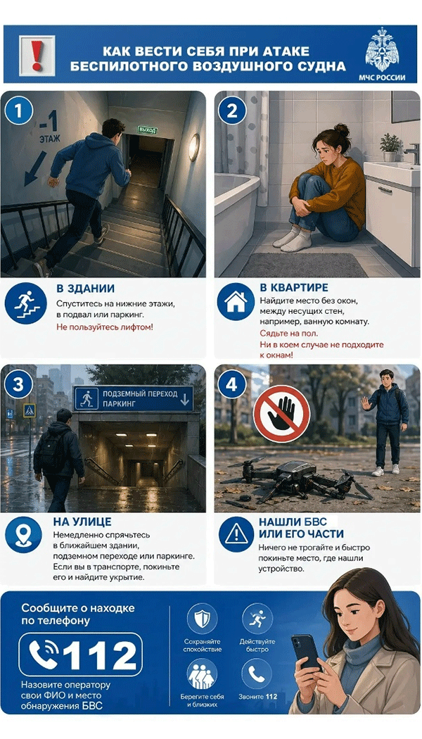 После атаки при обнаружении БПЛА или его частей их нельзя трогать. Нужно немедленно покинуть место обнаружения и сообщить в службу спасения.