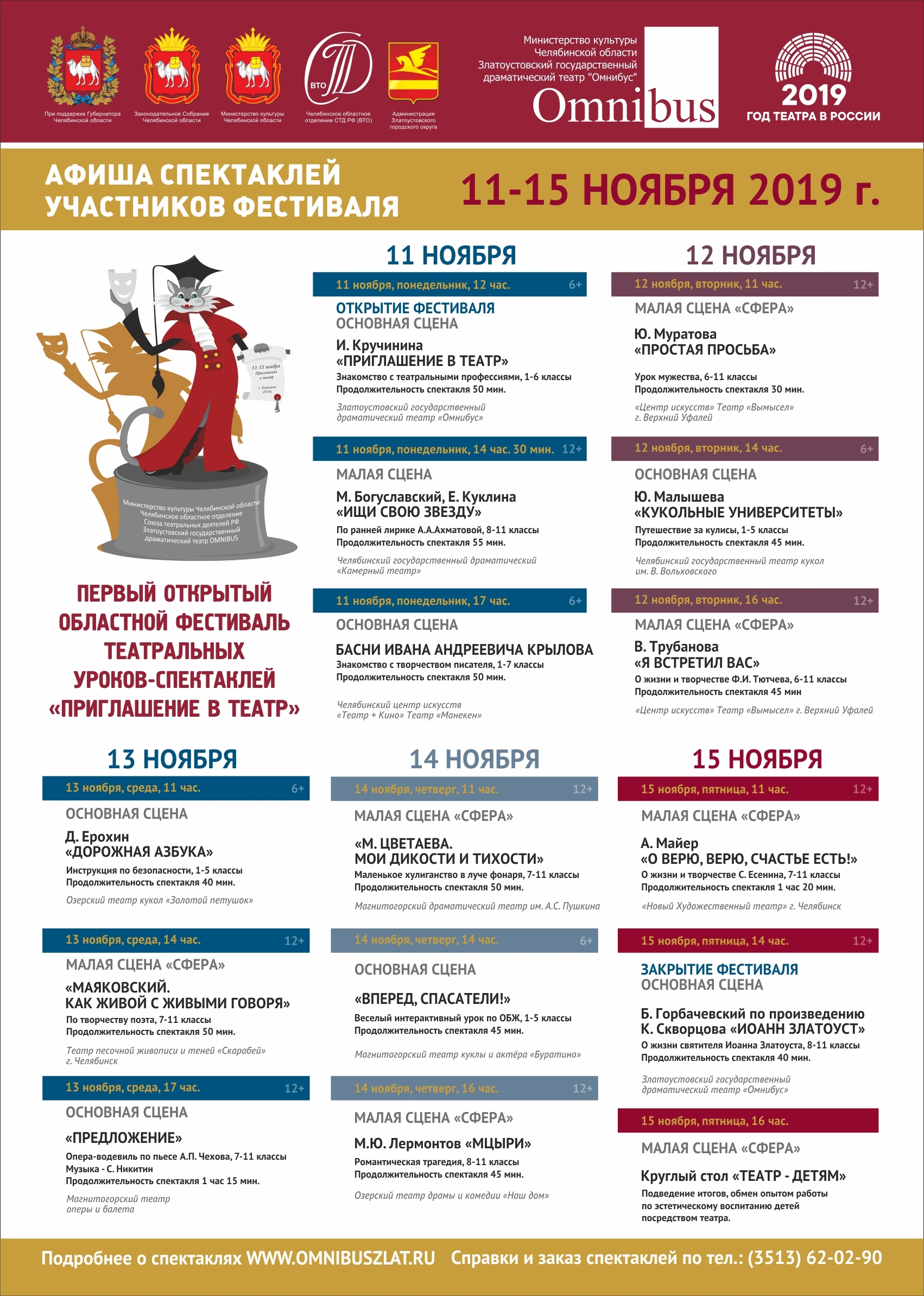 Первый областной фестиваль театральных уроков-спектаклей «Приглашение в театр» стартует 11 ноября в Златоусте (Челябинская область) – в конкурсе примут участие 12 театральных коллективов, в том числе пять челябинских, передает корреспондент Агентства новостей «Доступ» со ссылкой на пресс-службу Минкульта.