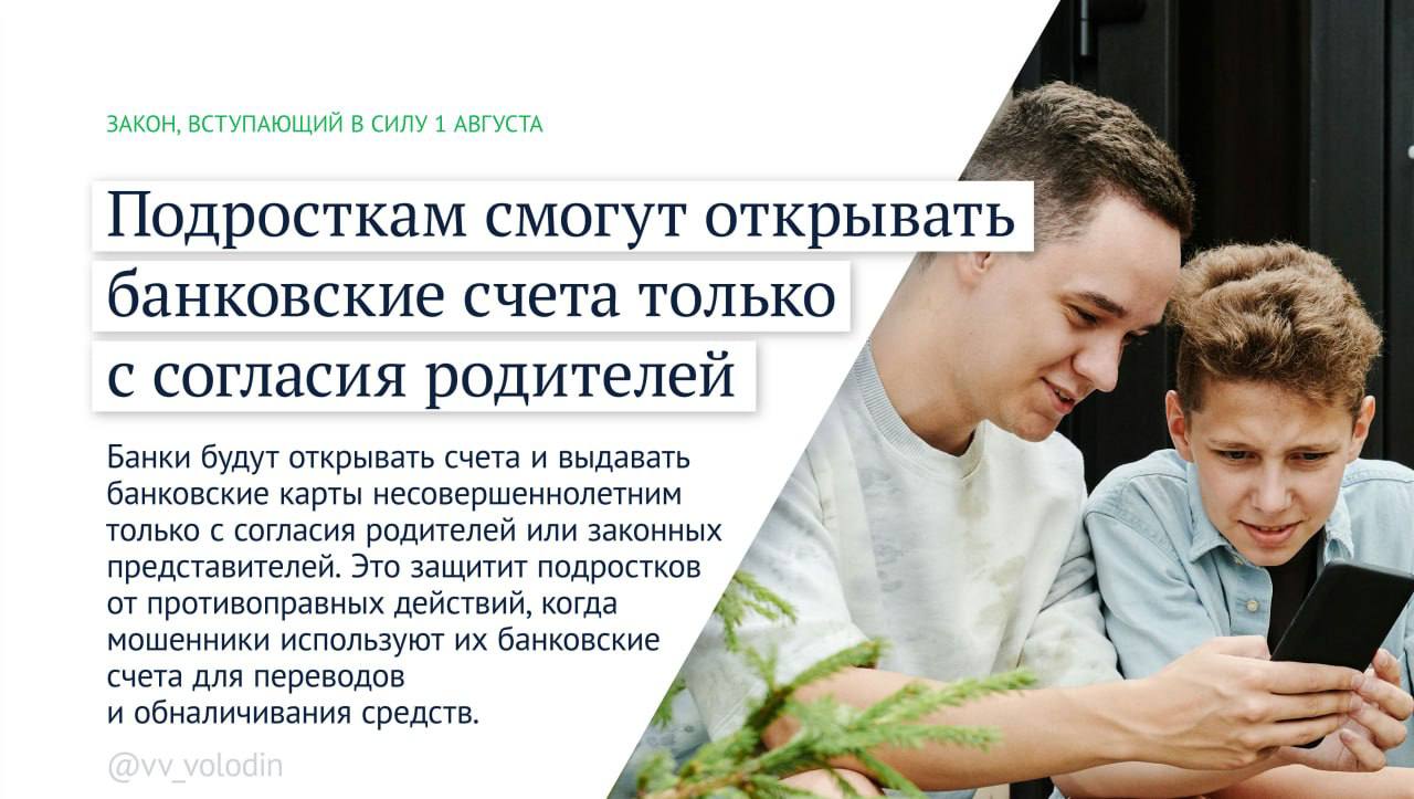 Банки будут открывать счета подросткам только с согласия родителей. «Несовершеннолетние зачастую становятся жертвами обмана, в результате которого их банковские карты используют для обналичивания похищенных средств. Под контролем родителей таких ситуаций удастся избежать», – говорит председатель Госдумы Вячеслав Володин.