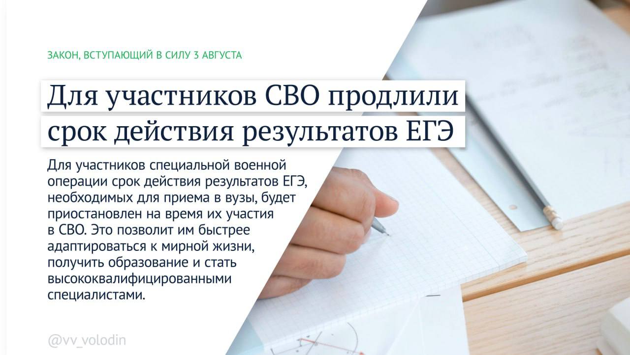 Для военнослужащих, участвующих в специальной военной операции, продлевается срок действия результатов ЕГЭ. «Мера будет способствовать повышению доступности образования для тех, кто защищает страну, а также позволит им быстрее адаптироваться после окончания службы», – отмечают в Госдуме.