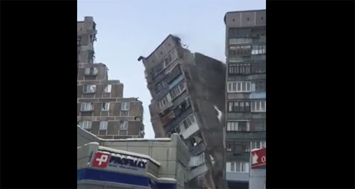 Обрушение пострадавшего от взрыва подъезда в Магнитогорске попало на видео