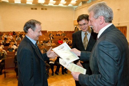 Главный инженер ВНИИТФ Владимир Знаменский торжественно вручил авторам копии 32 охранных документов, в числе которых 24 патента на изобретение, три патента на полезную модель, пять свидетельств о государственной регистрации программы для ЭВМ. Некоторые сотрудники, являясь авторами нескольких РИД, поднимались на сцену для вручения не один раз.