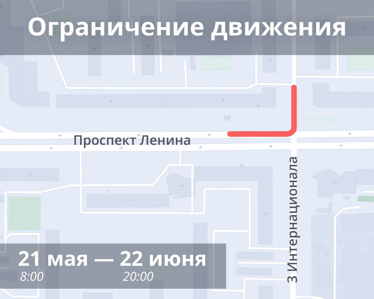 Также на этой неделе в связи с работами на сетях водоснабжения ограничено движение по правой полосе по улице 3-го Интернационала на пересечении с проспектом Ленина. Работы здесь продлятся до 22 июня.
