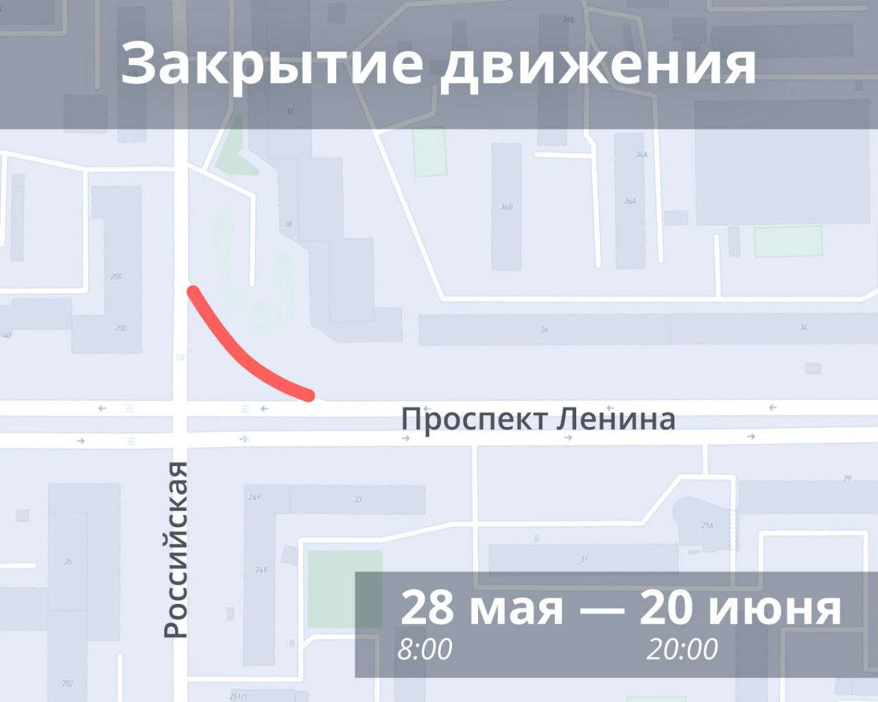 С воскресенья, 28 мая, и до 20 июня будет закрыто движение по правому отнесенному повороту с проспекта Ленина на улицу Российская.