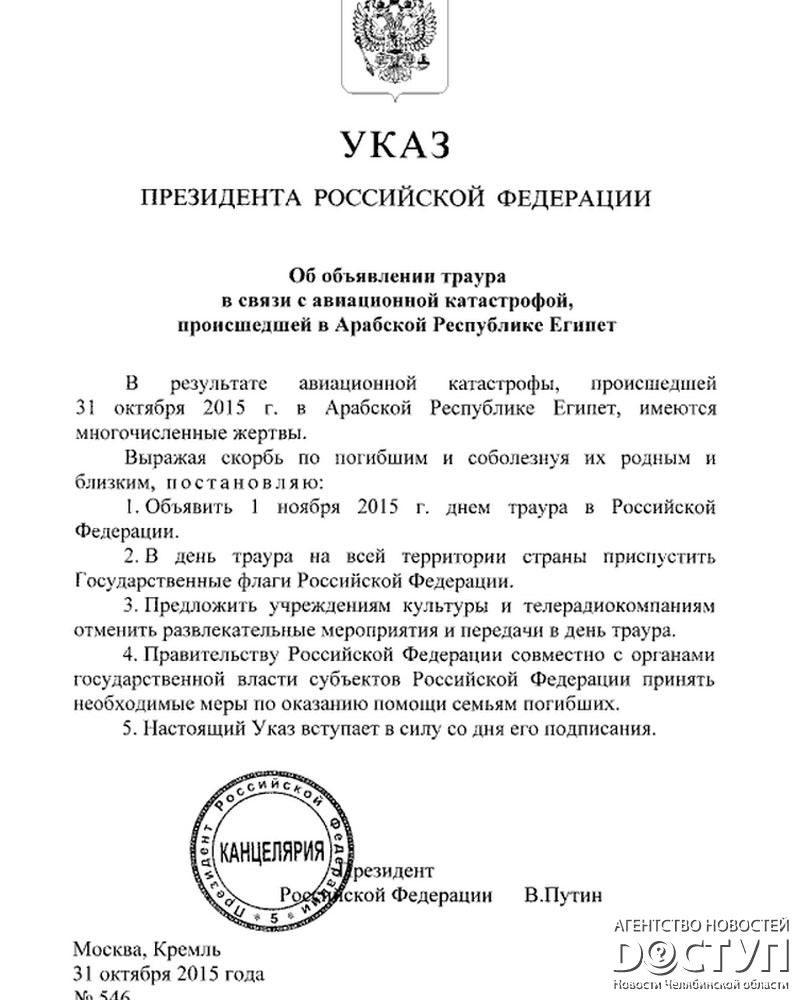 Воскресенье, 1 ноября, объявлен в России днем траура.