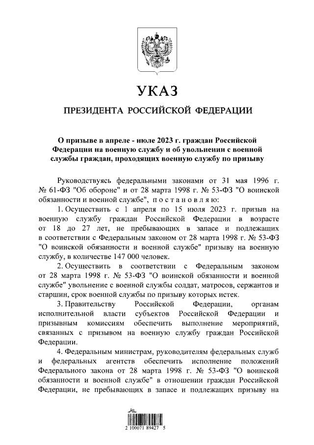 Согласно документу, с 1 апреля по 15 июля в Вооруженные силы РФ призовут 147 тыс. человек.