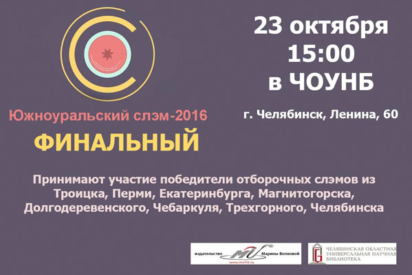 В воскресенье, 23 октября, в Челябинске состоится финальный слэм, завершающий соревнования поэтов на Южном Урале, – на финальный поединок съедутся победители отборочных слэмов, которые проводились с 30 июля по 15 октября в семи территориях Южного Урала, передает корреспондент Агентства новостей «Доступ» со ссылкой на пресс-службу регионального Минкульта.