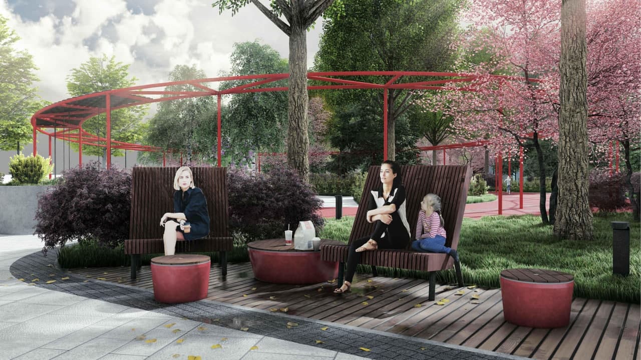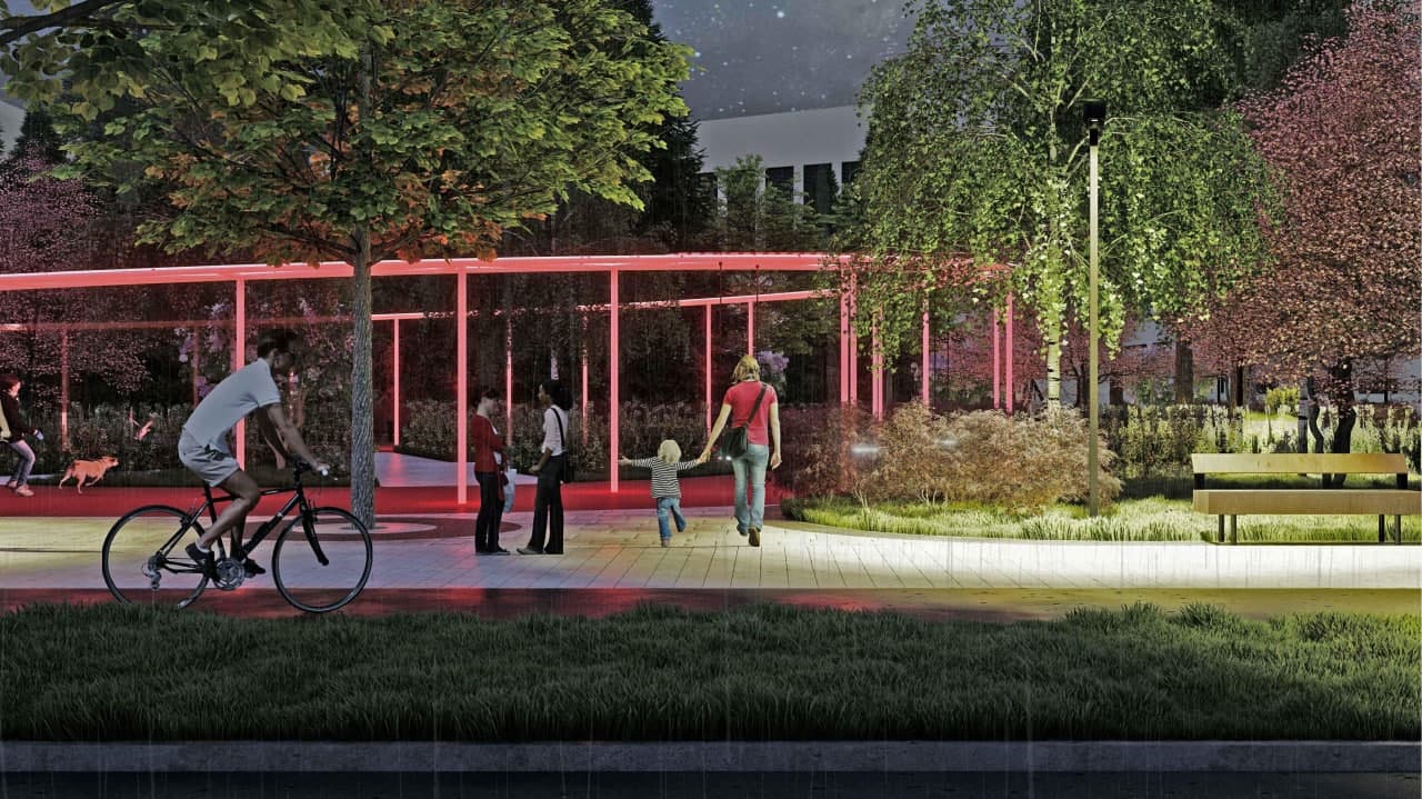 «На этом месте появится спортивное ядро: воркаут-площадка, боул (бетонная конструкция для скейтеров), мини-трибуна, а также много новых газонов с деревьями и кустарниками. Главные пешеходные пути освободятся от машин, и по краю тротуара вдоль улицы Труда расположится транзитная велодорожка. Прилегающая к ДС зеленая территория превратится в уголок природы с прогулочными дорожками и уютными местами, где есть столы для пинг-понга и настольных игр», – комментируют в управлении.