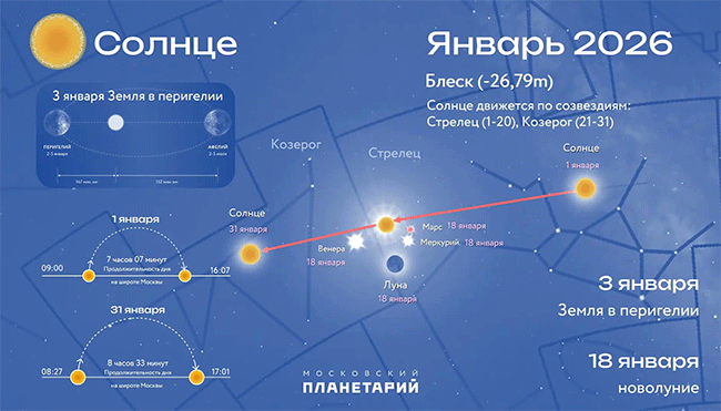«Третьего января – Земля в перигелии, на самом близком расстоянии от Солнца, это позволит нам наблюдать самый большой диск Солнца в 2026 году», – рассказали в Московском планетарии.