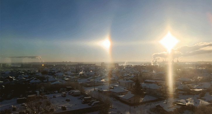Это природное явление возникает, когда солнечный свет преломляется в ледяных кристаллах в воздухе. В результате рядом с солнцем появляются яркие световые отражения.